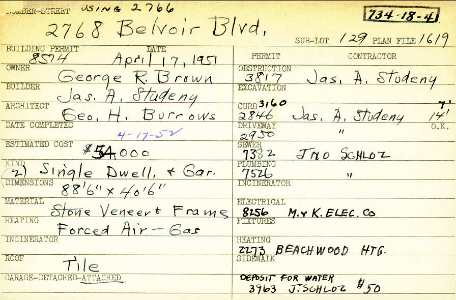 2766 Belvoir Boulevard Shaker Heights, OH 44122 PARCEL ID: 734-18-004 Building Permit Date: 04-17-1951 Plan File Number: 1619 all scanned Microfilm Roll: Roll025 Neighborhood: Mercer Owner: Brown, George R. Builder: Studeny, James A. Architect: Burrows, George H. Estimated Cost: 54000 Date Completed: 04-17-1952 Kind: Single, Single Residence or Dwelling (2) Material: Stone Veneer and Frame Heating: Forced Air - Gas Roof: Tile Garage: attached Card Available: Yes |