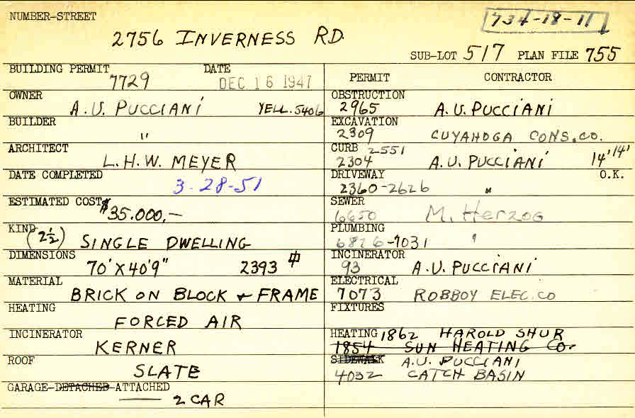 2756 Inverness Road Shaker Heights, OH 44122 PARCEL ID: 734-18-011 Building Permit Date: 12-16-1947 Plan File Number: 755 all scanned Microfilm Roll: Roll010 Neighborhood: Mercer Owner: Pucciani, A. U. Builder: Pucciani, A. U. Architect: Meyer, L. H. W. Estimated Cost: 35000 Date Completed: 03-28-1951 Kind: Single 2-1/2 Material: Brick on Block and Frame Heating: Forced Air Roof: Slate Garage: attached 2 car |