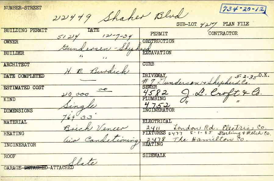 22449 Shaker Boulevard Shaker Heights, OH 44122 PARCEL ID: 734-20-012 Building Permit Date: 12-07-1934 Plan File Number: 0 Neighborhood: Mercer Owner: Gundersen - Shepherd Builder: Gundersen - Shepherd Architect: Burdick, H. B. Estimated Cost: 20000 Kind: Single, Single Residence or Dwelling Material: Brick Veneer Heating: Air Conditioned Roof: Slate Garage: attached Card Available: yes |