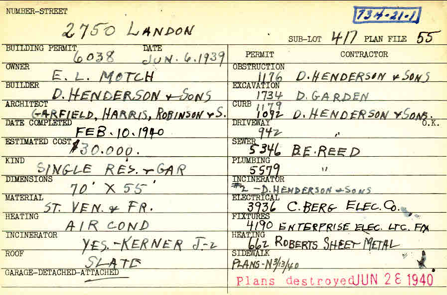 2750 Landon Road Shaker Heights, OH 44122 PARCEL ID: 734-21-001 Building Permit Date: 06-06-1939 Plan File Number: 55, 5555, 5874, 6880, 11320, 11939 Microfilm Roll: Roll#75, Roll#79, Roll#89, NewRoll#7, NewRoll#10 Neighborhood: Mercer Owner: Motch, E. L. Builder: D. Henderson and Sons Architect: Garfield, Harris, Robinson and Schafer Estimated Cost: 30000 Date Completed: 02-10-1940 Kind: Single Dwelling and Garage Material: Stone Veneer and Frame Heating: Air Conditioned Roof: Slate Garage: attached |