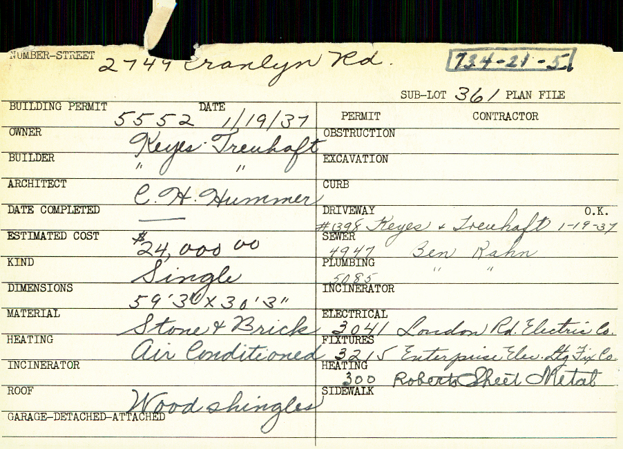 2749 Cranlyn Road Shaker Heights, OH 44122 PARCEL ID: 734-21-005 Building Permit Date: 01-19-1937 Plan File Number: 10326 Microfilm Roll: NewRoll#3 Neighborhood: Mercer Owner: Keyes and Treuhaft Builder: Keyes and Treuhaft Architect: Hummer, C. H. Estimated Cost: 24000 Kind: Single, Single Residence or Dwelling Material: Stone and Brick Heating: Air Conditioned Roof: Wood Shingle |