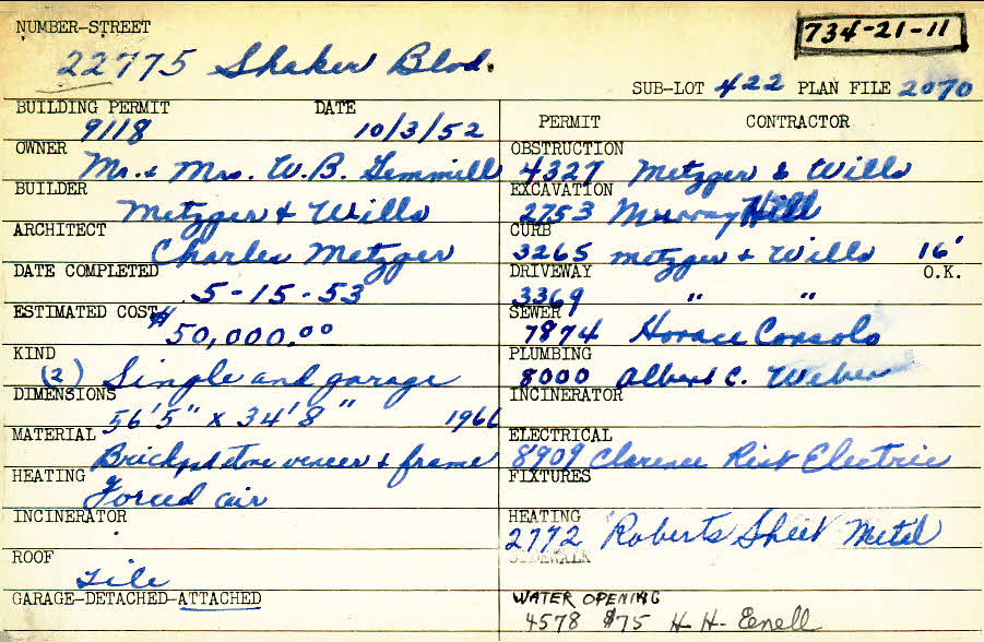 22775 Shaker Boulevard Shaker Heights, OH 44122 PARCEL ID: 734-21-011 Building Permit Date: 10-03-1952 Plan File Number: 2070, 7944 Microfilm Roll: Roll#31, Roll#95 Neighborhood: Mercer Owner: Gemmill, Mr. and Mrs. W. B. Builder: Metzger and Wills Architect: Metzger, Charles A. Estimated Cost: 50000 Date Completed: 05-15-1953 Kind: Single Dwelling and Garage (2) Material: Brick and Stone Veneer and Frame Heating: Forced Air Roof: Tile Garage: attached |