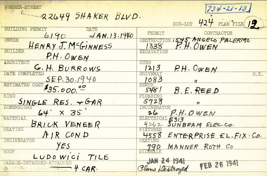 22649 Shaker Boulevard Shaker Heights, OH 44122 PARCEL ID: 734-21-013 Building Permit Date: 01-13-1940 Plan File Number: 12, 11666 Microfilm Roll: NewRoll#8 Neighborhood: Mercer Owner: McGinness, Henry J. Builder: Owen, P. H. Architect: Burrows, G. H. Estimated Cost: 35000 Date Completed: 09-30-1940 Kind: Single Dwelling and Garage Material: Brick Veneer Heating: Air Conditioned Roof: Tile Garage: attached |