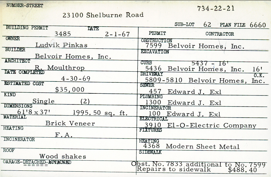 23100 Shelburne Road Shaker Heights, OH 44122 PARCEL ID: 734-22-021 Building Permit Date: 02-01-1967 Plan File Number: 6660, 7383 Microfilm Roll: Roll#34, Roll#51, Roll#73, Roll#84, Roll#85, Roll#87, Roll#92 Neighborhood: Mercer Owner: Pinkas, Ludvik Builder: Belvoir Homes, Inc. Architect: Moulthrop, R. Estimated Cost: 35000 Date Completed: 04-30-1969 Kind: Single, Single Residence or Dwelling (2) Material: Brick Veneer Heating: Forced Air Roof: Wood Shakes Garage: detached |