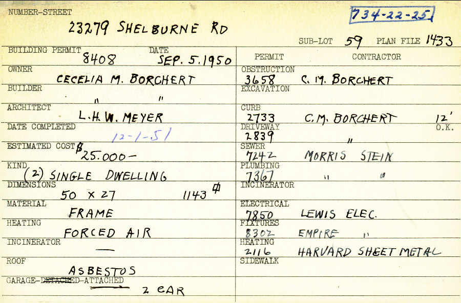 23279 Shelburne Road Shaker Heights, OH 44122 PARCEL ID: 734-22-025 Building Permit Date: 09-05-1950 Plan File Number: 1433 scanned, 9134 Microfilm Roll: Roll016, Roll#102 Neighborhood: Mercer Owner: Borchert, Cecelia M. Builder: Borchert, Cecelia M. Architect: Meyer, L. H. W. Estimated Cost: 25000 Date Completed: 12-01-1951 Kind: Single, Single Residence or Dwelling (2) Material: Frame Heating: Forced Air Roof: Asbestos Garage: attached 2 car |
