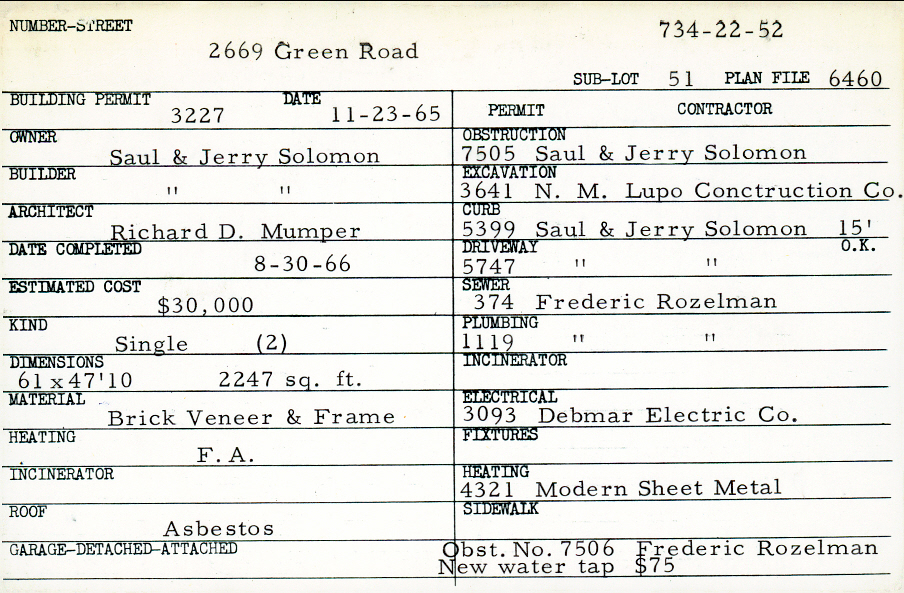 2669 Green Road Shaker Heights, OH 44122 PARCEL ID: 734-22-052 Building Permit Date: 11-23-1965 Plan File Number: 5678, 6460 Microfilm Roll: Roll#77, Roll#86 Neighborhood: Mercer Owner: Solomon, Saul and Jerry Builder: Solomon, Saul and Jerry Architect: Mumper, Richard D. Estimated Cost: 30000 Date Completed: 08-30-1966 Kind: Single, Single Residence or Dwelling (2) Material: Brick Veneer and Frame Heating: Forced Air Roof: Asbestos |