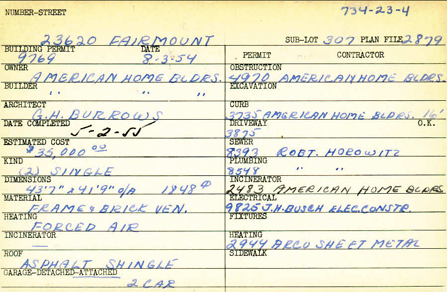 23620 Fairmount Boulevard Shaker Heights, OH 44122 PARCEL ID: 734-23-004 Building Permit Date: 08-03-1954 Plan File Number: 2879 all scanned Microfilm Roll: Roll041 Neighborhood: Mercer Owner: American Home Builders Builder: American Home Builders Architect: Burrows, G. H. Estimated Cost: 35000 Date Completed: 05-02-1955 Kind: Single, Single Residence or Dwelling (2) Material: Frame and Brick Veneer Heating: Forced Air Roof: Asphalt Shingles Garage: attached 2 car |