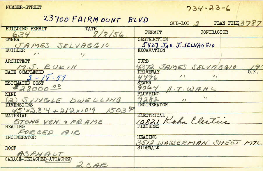 23700 Fairmount Boulevard Shaker Heights, OH 44122 PARCEL ID: 734-23-006 Building Permit Date: 08-08-1956 Plan File Number: 3787, 6948 Microfilm Roll: Roll#56, Roll#90 Neighborhood: Mercer Owner: Selvaggio, James Builder: Selvaggio, James Architect: Rukin, M. J. Estimated Cost: 28000 Date Completed: 02-18-1957 Kind: Single, Single Residence or Dwelling (2) Material: Stone Veneer and Frame Heating: Forced Air Roof: Asphalt Garage: attached 2 car |