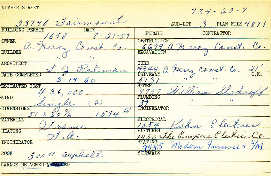 23740 Fairmount Boulevard Shaker Heights, OH 44122 PARCEL ID: 734-23-007 Building Permit Date: 08-21-1959 Plan File Number: 4871 Microfilm Roll: Roll#67 Neighborhood: Mercer Owner: A. Hercy Construction Company Builder: A. Hercy Construction Company Architect: Rotman, L. J. Estimated Cost: 36000 Date Completed: 03-19-1960 Kind: Single, Single Residence or Dwelling (2) Material: Frame Heating: Forced Air Roof: Asphalt Garage: detached |