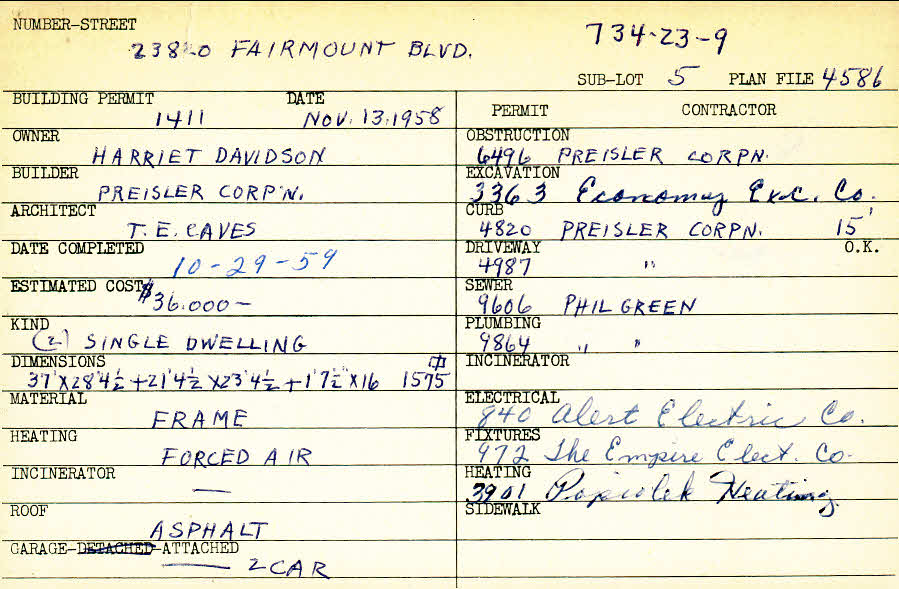 23820 Fairmount Boulevard Shaker Heights, OH 44122 PARCEL ID: 734-23-009 Building Permit Date: 11-13-1958 Plan File Number: 4586 Microfilm Roll: Roll#64 Neighborhood: Mercer Owner: Davidson, Harriet Builder: Preisler Corporation Architect: Caves, T. E. Estimated Cost: 36000 Date Completed: 10-29-1959 Kind: Single, Single Residence or Dwelling (2) Material: Frame Heating: Forced Air Roof: Asphalt Garage: attached 2 car |