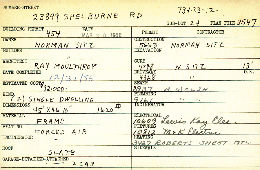 23899 Shelburne Road Shaker Heights, OH 44122 PARCEL ID: 734-23-012 Building Permit Date: 03-30-1956 Plan File Number: 3547 Microfilm Roll: Roll#52 Neighborhood: Mercer Owner: Sitz, Norman Builder: Sitz, Norman Architect: Moulthrop, Ray Estimated Cost: 32000 Date Completed: 12-31-1956 Kind: Single, Single Residence or Dwelling (2) Material: Frame Heating: Forced Air Roof: Slate Garage: attached 2 car |