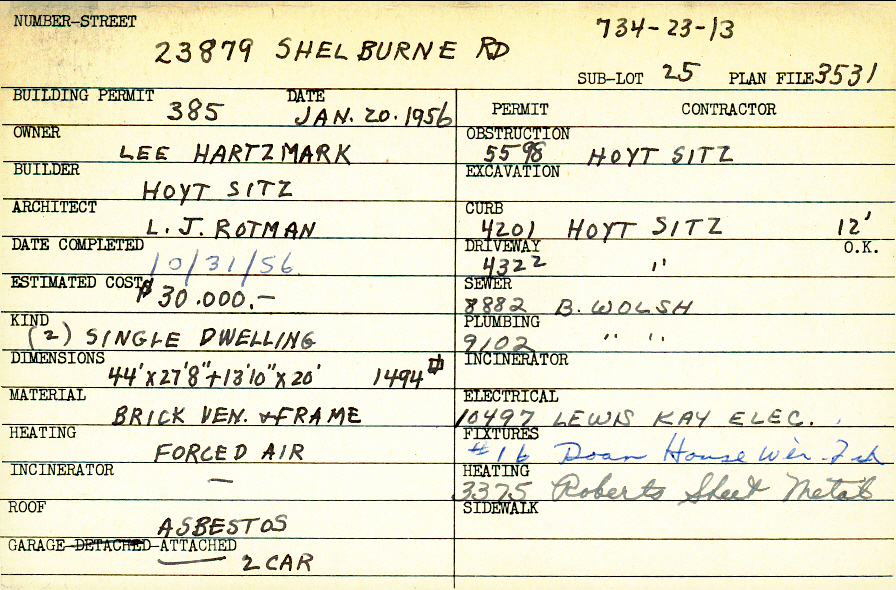 23879 Shelburne Road Shaker Heights, OH 44122 PARCEL ID: 734-23-013 Building Permit Date: 01-20-1956 Plan File Number: 3531, 5539 Microfilm Roll: Roll#75 Neighborhood: Mercer Owner: Hartzmark, Lee Builder: Sitz, Hoyt Architect: Rotman, L. J. Estimated Cost: 30000 Date Completed: 10-31-1956 Kind: Single, Single Residence or Dwelling (2) Material: Brick Veneer and Frame Heating: Forced Air Roof: Asbestos Garage: attached 2 car |