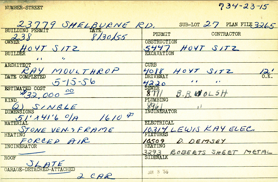 23779 Shelburne Road Shaker Heights, OH 44122 PARCEL ID: 734-23-015 Building Permit Date: 08-30-1955 Plan File Number: 3265, 4950 Microfilm Roll: Roll#47, Roll#68 Neighborhood: Mercer Owner: Sitz, Hoyt Builder: Sitz, Hoyt Architect: Moulthrop, Ray Estimated Cost: 32000 Date Completed: 05-15-1956 Kind: Single, Single Residence or Dwelling (2) Material: Stone Veneer and Frame Heating: Forced Air Roof: Slate Garage: attached 2 car |
