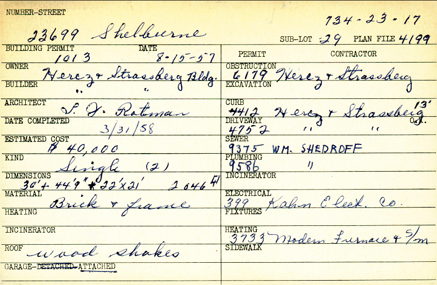 23699 Shelburne Road Shaker Heights, OH 44122 PARCEL ID: 734-23-017 Building Permit Date: 08-15-1957 Plan File Number: 4153, 4199 Microfilm Roll: Roll#61 Neighborhood: Mercer Owner: Hercz and Strassberg Building Builder: Hercz and Strassberg Building Architect: Rotman, L. J. Estimated Cost: 40000 Date Completed: 03-31-1958 Kind: Single, Single Residence or Dwelling (2) Material: Brick and Frame Roof: Wood Shakes Garage: attached |
