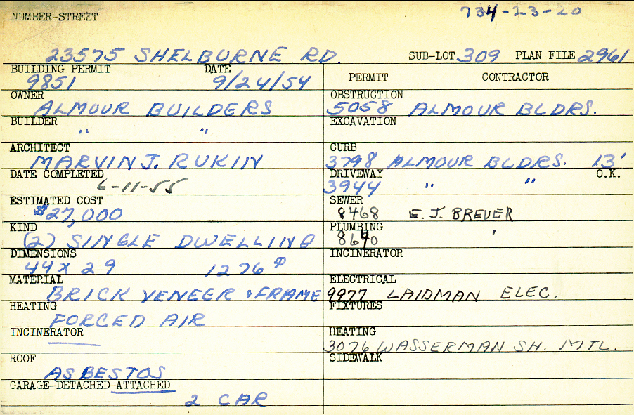 23575 Shelburne Road Shaker Heights, OH 44122 PARCEL ID: 734-23-020 Building Permit Date: 09-24-1954 Plan File Number: 2961, 10574, 12242 Microfilm Roll: Roll#42, NewRoll#4, NewRoll#12 Neighborhood: Mercer Owner: Almour Builders Builder: Almour Builders Architect: Rukin, Marvin J. Estimated Cost: 27000 Date Completed: 06-11-1955 Kind: Single, Single Residence or Dwelling (2) Material: Brick Veneer and Frame Heating: Forced Air Roof: Asbestos Garage: attached 2 car |