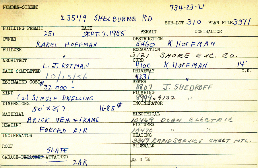23549 Shelburne Road Shaker Heights, OH 44122 PARCEL ID: 734-23-021 Building Permit Date: 09-07-1955 Plan File Number: 3371, 5150, 7604 Microfilm Roll: Roll#49, Roll#70, Roll#93 Neighborhood: Mercer Owner: Hoffman, Karel Builder: Hoffman, Karel Architect: Rotman, L. J. Estimated Cost: 32000 Date Completed: 10-15-1956 Kind: Single, Single Residence or Dwelling (2) Material: Brick Veneer and Frame Heating: Forced Air Roof: Slate Garage: attached 2 car |