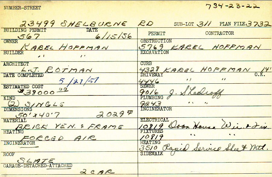 23499 Shelburne Road Shaker Heights, OH 44122 PARCEL ID: 734-23-022 Building Permit Date: 06-15-1956 Plan File Number: 3732, 4484, 7163, 7817, 11189 Microfilm Roll: Roll#51,Roll#63, Roll#91, Roll#94, NewRoll#7 Neighborhood: Mercer Owner: Hoffman, Karel Builder: Hoffman, Karel Architect: Rotman, L. J. Estimated Cost: 38000 Date Completed: 05-21-1957 Kind: Single, Single Residence or Dwelling (2) Material: Brick Veneer and Frame Heating: Forced Air Roof: Slate Garage: attached 2 car |