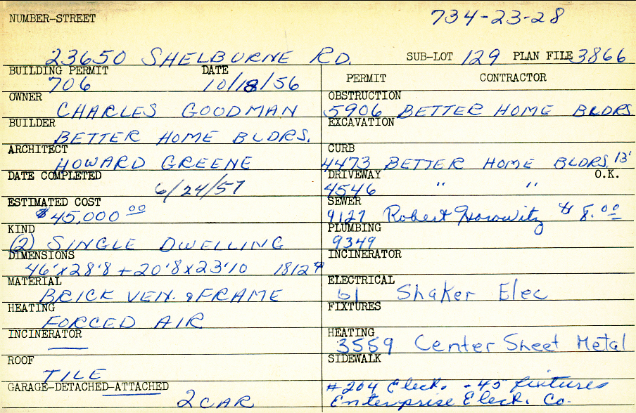 23650 Shelburne Road Shaker Heights, OH 44122 PARCEL ID: 734-23-028 Building Permit Date: 10-18-1956 Plan File Number: 3866 Microfilm Roll: Roll#56 Neighborhood: Mercer Owner: Goodman, Charles Builder: Better Home Builders Architect: Greene, Howard Estimated Cost: 45000 Date Completed: 06-24-1957 Kind: Single, Single Residence or Dwelling (2) Material: Brick Veneer and Frame Heating: Forced Air Roof: Tile Garage: attached 2 car |