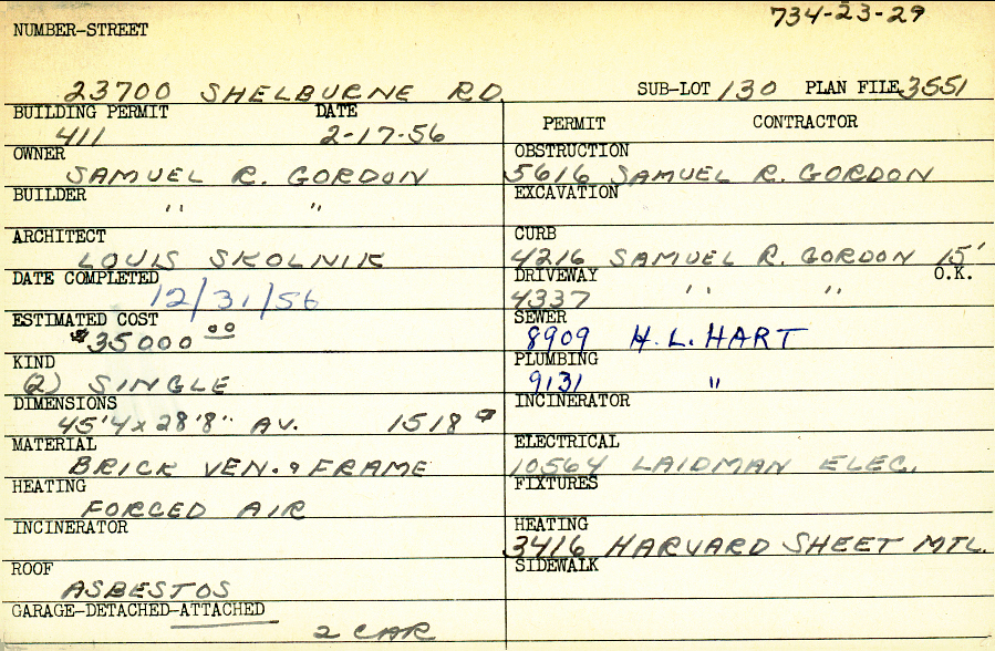 23700 Shelburne Road Shaker Heights, OH 44122 PARCEL ID: 734-23-029 Building Permit Date: 02-17-1956 Plan File Number: 3551 Microfilm Roll: Roll#52 Neighborhood: Mercer Owner: Gordon, Samuel R. Builder: Gordon, Samuel R. Architect: Skolnik, Louis Estimated Cost: 35000 Date Completed: 12-31-1956 Kind: Single, Single Residence or Dwelling (2) Material: Brick Veneer and Frame Heating: Forced Air Roof: Asbestos Garage: attached 2 car |