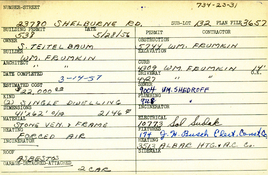 23780 Shelburne Road Shaker Heights, OH 44122 PARCEL ID: 734-23-031 Building Permit Date: 05-28-1956 Plan File Number: 3657 Microfilm Roll: Roll#54 Neighborhood: Mercer Owner: Teitelbaum, S. Builder: Frumkin, William Architect: Frumkin, William Estimated Cost: 22000 Date Completed: 03-14-1957 Kind: Single, Single Residence or Dwelling (2) Material: Stone Veneer and Frame Heating: Forced Air Roof: Asbestos Garage: attached 2 car |