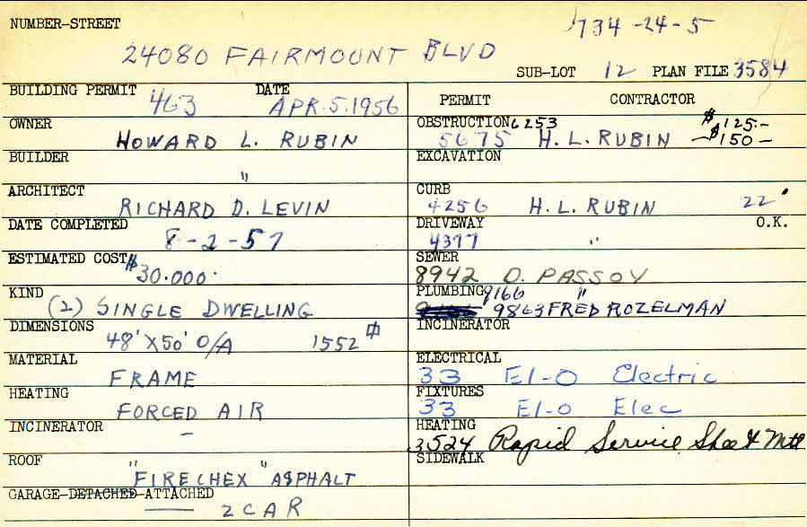 24080 Fairmount Boulevard Shaker Heights, OH 44122 PARCEL ID: 734-24-005 Building Permit Date: 04-05-1956 Plan File Number: 3584 Microfilm Roll: Roll#52 Neighborhood: Mercer Owner: Rubin, Howard L. Builder: Rubin, Howard L. Architect: Levin, Richard D. Estimated Cost: 30000 Date Completed: 08-02-1957 Kind: Single, Single Residence or Dwelling (2) Material: Frame Heating: Forced Air Roof: Asphalt Garage: attached 2 car |