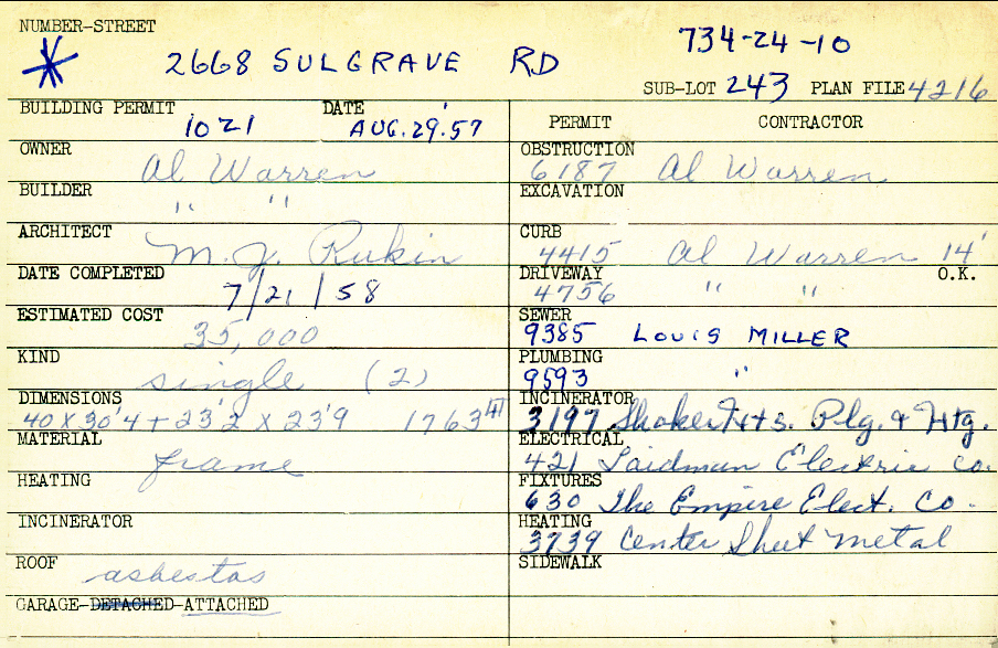 2668 Sulgrave Road Shaker Heights, OH 44122 PARCEL ID: 734-24-010 Building Permit Date: 08-29-1957 Plan File Number: 4216 Microfilm Roll: Roll#61 Neighborhood: Mercer Owner: Warren, Al Builder: Warren, Al Architect: Rukin, M. J. Estimated Cost: 35000 Date Completed: 07-21-1958 Kind: Single, Single Residence or Dwelling (2) Material: Frame Roof: Asbestos Garage: attached |