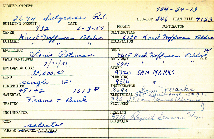 2674 Sulgrave Road Shaker Heights, OH 44122 PARCEL ID: 734-24-013 Building Permit Date: 06-03-1957 Plan File Number: 4123, 6162 Microfilm Roll: Roll#83 Neighborhood: Mercer Owner: Karel Hoffman Builders Builder: Karel Hoffman Builders Architect: Rotman, Louis Estimated Cost: 35000 Date Completed: 02-21-1958 Kind: Single, Single Residence or Dwelling (2) Material: Frame and Brick Roof: Asbestos Garage: attached |