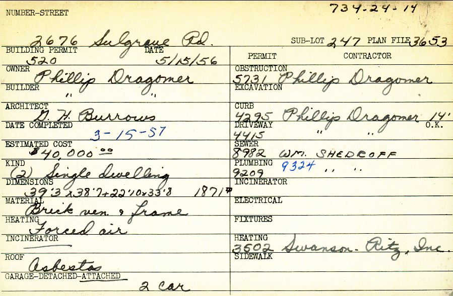 2676 Sulgrave Road Shaker Heights, OH 44122 PARCEL ID: 734-24-014 Building Permit Date: 05-15-1956 Plan File Number: 3653 Microfilm Roll: Roll#54 Neighborhood: Mercer Owner: Dragomer, Phillip Builder: Dragomer, Phillip Architect: Burrows, G. H. Estimated Cost: 40000 Date Completed: 03-15-1957 Kind: Single, Single Residence or Dwelling (2) Material: Brick Veneer and Frame Heating: Forced Air Roof: Asbestos Garage: attached 2 car |