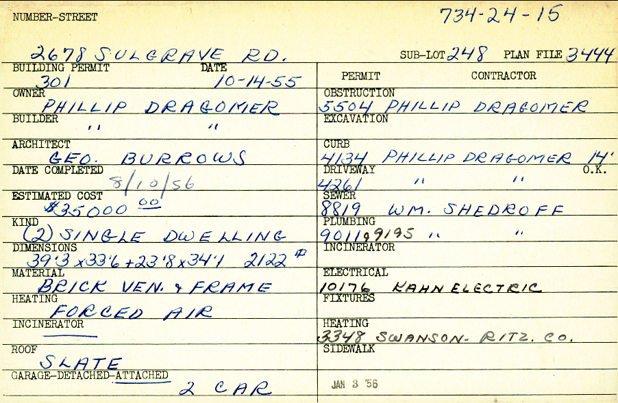 2678 Sulgrave Road Shaker Heights, OH 44122 PARCEL ID: 734-24-015 Building Permit Date: 10-14-1955 Plan File Number: 3444 Microfilm Roll: Roll#51 Neighborhood: Mercer Owner: Dragomer, Phillip Builder: Dragomer, Phillip Architect: Burrows, George Estimated Cost: 35000 Date Completed: 08-10-1956 Kind: Single, Single Residence or Dwelling (2) Material: Brick Veneer and Frame Heating: Forced Air Roof: Slate Garage: attached 2 car |