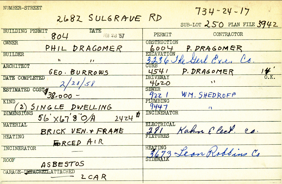 2682 Sulgrave Road Shaker Heights, OH 44122 PARCEL ID: 734-24-017 Building Permit Date: 02-28-1957 Plan File Number: 3942 Microfilm Roll: Roll#58 Neighborhood: Mercer Owner: Dragomer, Phil Builder: Dragomer, Phil Architect: Burrows, George Estimated Cost: 38000 Date Completed: 02-28-1958 Kind: Single, Single Residence or Dwelling (2) Material: Brick Veneer and Frame Heating: Forced Air Roof: Asbestos Garage: attached 2 car |