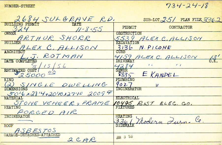 2684 Sulgrave Road Shaker Heights, OH 44122 PARCEL ID: 734-24-018 Building Permit Date: 11-08-1955 Plan File Number: 3362, 4325 scanned, 7366 Microfilm Roll: Roll#48, Roll062, Roll#92 Neighborhood: Mercer Owner: Shorr, Arthur Builder: Allison, Alex C. Architect: Rotman, L. J. Estimated Cost: 25000 Date Completed: 08-15-1956 Kind: Single, Single Residence or Dwelling (2) Material: Stone Veneer and Frame Heating: Forced Air Roof: Asbestos Garage: attached 2 car |