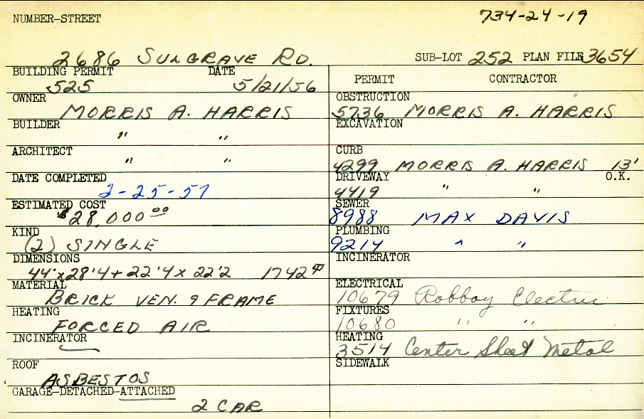 2686 Sulgrave Road Shaker Heights, OH 44122 PARCEL ID: 734-24-019 Building Permit Date: 05-21-1956 Plan File Number: 3654 Microfilm Roll: Roll#54 Neighborhood: Mercer Owner: Harris, Morris A. Builder: Harris, Morris A. Architect: Harris, Morris A. Estimated Cost: 28000 Date Completed: 02-25-1957 Kind: Single, Single Residence or Dwelling (2) Material: Brick Veneer and Frame Heating: Forced Air Roof: Asbestos Garage: attached 2 car |