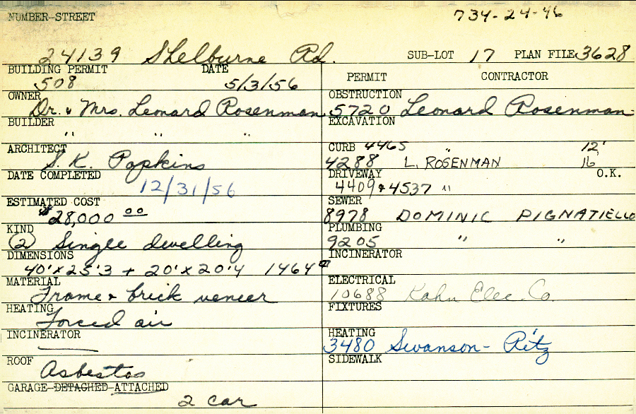 24139 Shelburne Road Shaker Heights, OH 44122 PARCEL ID: 734-24-046 Building Permit Date: 05-03-1956 Plan File Number: 3628, 5682 all scanned Microfilm Roll: Roll#54, Roll#77 Neighborhood: Mercer Owner: Rosenman, Dr. and Mrs. Leonard Builder: Rosenman, Dr. and Mrs. Leonard Architect: Popkins, S. K. Estimated Cost: 28000 Date Completed: 12-31-1956 Kind: Single, Single Residence or Dwelling (2) Material: Frame and Brick Veneer Heating: Forced Air Roof: Asbestos Garage: attached 2 car |