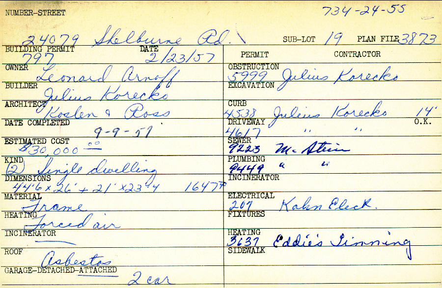 24079 Shelburne Road Shaker Heights, OH 44122 PARCEL ID: 734-24-055 Building Permit Date: 02-23-1957 Plan File Number: 3873 Microfilm Roll: Roll#56 Neighborhood: Mercer Owner: Arnoff, Leonard Builder: Korecko, Julius Architect: Koslen and Ross Estimated Cost: 30000 Date Completed: 09-09-1957 Kind: Single, Single Residence or Dwelling (2) Material: Frame Heating: Forced Air Roof: Asbestos Garage: attached 2 car |
