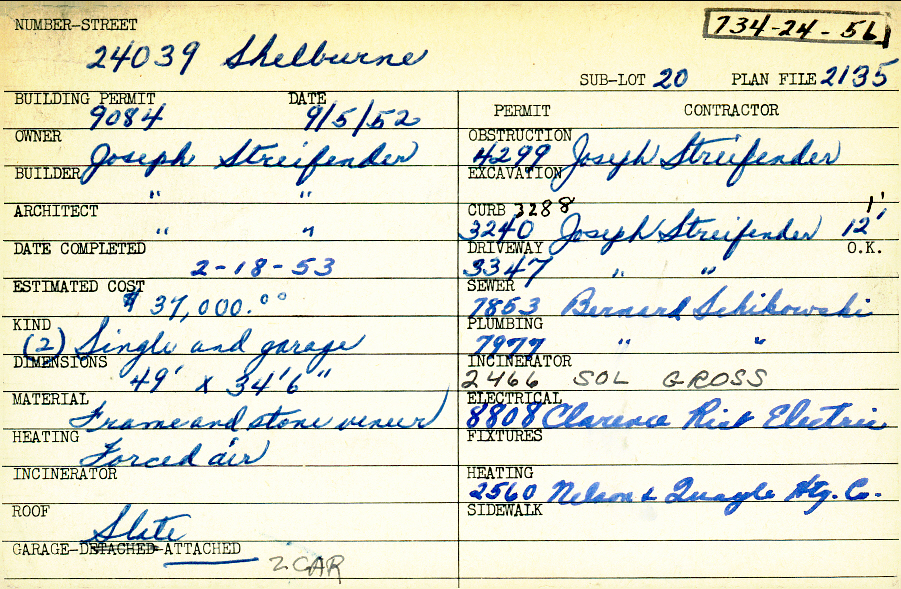 24039 Shelburne Road Shaker Heights, OH 44122 PARCEL ID: 734-24-056 Building Permit Date: 09-05-1952 Plan File Number: 2135 Microfilm Roll: Roll#32 Neighborhood: Mercer Owner: Streifender, Joseph Builder: Streifender, Joseph Architect: Streifender, Joseph Estimated Cost: 37000 Date Completed: 02-18-1953 Kind: Single Dwelling and Garage (2) Material: Frame and Stone Veneer Heating: Forced Air Roof: Slate Garage: attached 2 car |