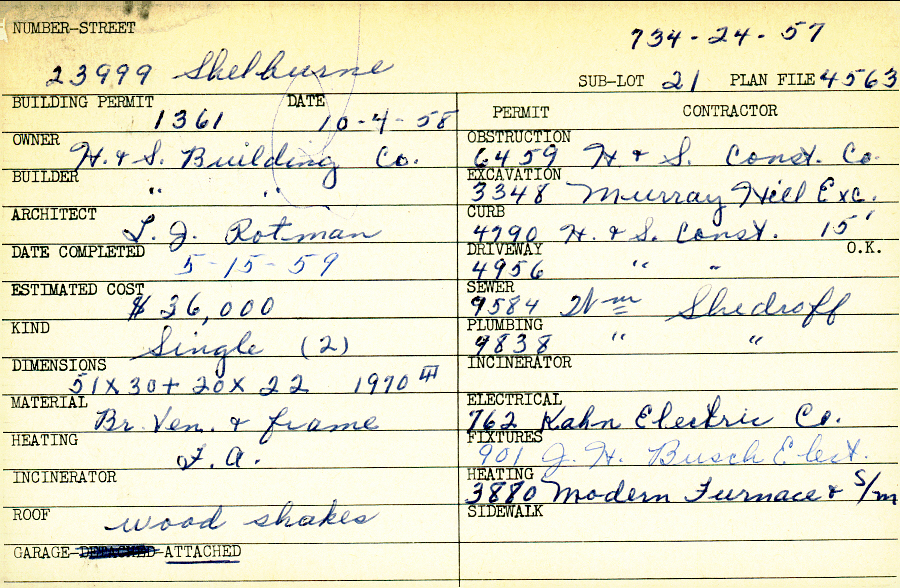23999 Shelburne Road Shaker Heights, OH 44122 PARCEL ID: 734-24-057 Building Permit Date: 10-04-1958 Plan File Number: 4563 Microfilm Roll: Roll#63 Neighborhood: Mercer Owner: H. and S. Building Company Builder: H. and S. Building Company Architect: Rotman, L. J. Estimated Cost: 36000 Date Completed: 05-15-1959 Kind: Single, Single Residence or Dwelling (2) Material: Brick Veneer and Frame Heating: Forced Air Roof: Wood Shakes Garage: attached |