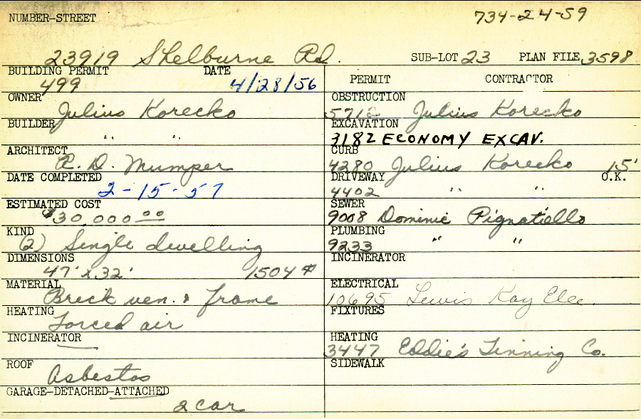 23919 Shelburne Road Shaker Heights, OH 44122 PARCEL ID: 734-24-059 Building Permit Date: 04-28-1956 Plan File Number: 3598 Microfilm Roll: Roll#52 Neighborhood: Mercer Owner: Korecko, Julius Builder: Korecko, Julius Architect: Mumper, R. D. Estimated Cost: 30000 Date Completed: 02-15-1957 Kind: Single, Single Residence or Dwelling (2) Material: Brick Veneer and Frame Heating: Forced Air Roof: Asbestos Garage: attached 2 car |
