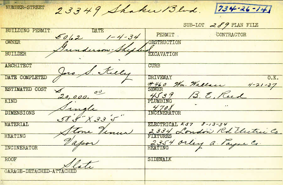 23349 Shaker Boulevard Shaker Heights, OH 44122 PARCEL ID: 734-26-014 Building Permit Date: 01-04-1934 Plan File Number: 0 Neighborhood: Mercer Owner: Gundersen - Shepherd Builder: Gundersen - Shepherd Architect: Kelly, John Sherwood Estimated Cost: 20000 Kind: Single, Single Residence or Dwelling Material: Stone Veneer Heating: Vapor Roof: Slate |