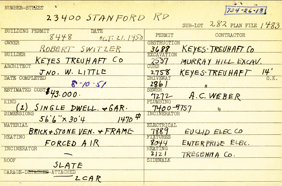 23400 Stanford Road Shaker Heights, OH 44122 PARCEL ID: 734-26-018 Building Permit Date: 10-21-1950 Plan File Number: 1483 scanned, 3209, 5686 Microfilm Roll: Roll017, Roll#47, Roll#77 Neighborhood: Mercer Owner: Switzer, Robert Builder: Keyes Treuhaft Company Architect: Little, John W. Estimated Cost: 43000 Date Completed: 08-10-1951 Kind: Single Dwelling and Garage (2) Material: Brick and Stone Veneer and Frame Heating: Forced Air Roof: Slate Garage: attached 2 car |