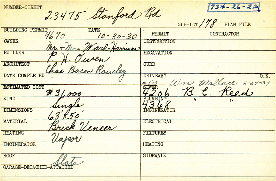 23475 Stanford Road Shaker Heights, OH 44122 PARCEL ID: 734-26-022 Building Permit Date: 10-30-1930 Plan File Number: 0 Neighborhood: Mercer Owner: Harrison, Mr. and Mrs. Ward Builder: Owen, P. H. Architect: Rowley, Charles Bacon Estimated Cost: 31000 Kind: Single, Single Residence or Dwelling Material: Brick Veneer Heating: Vapor Roof: Slate |