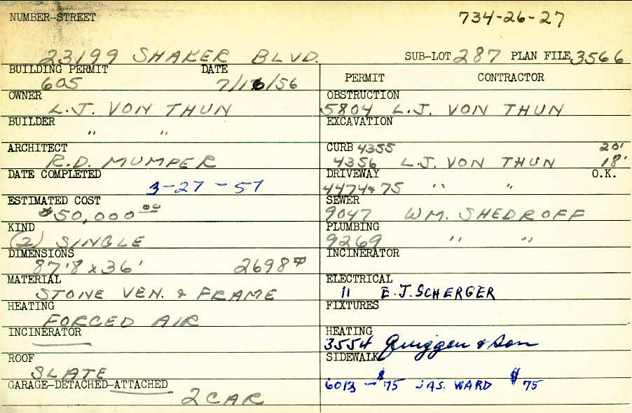 23199 Shaker Boulevard Shaker Heights, OH 44122 PARCEL ID: 734-26-027 Building Permit Date: 07-16-1956 Plan File Number: 3566, 5097 Microfilm Roll: Roll#52, Roll#69 Neighborhood: Mercer Owner: Von Thun, L. J. Builder: Von Thun, L. J. Architect: Mumper, R. D. Estimated Cost: 50000 Date Completed: 03-27-1957 Kind: Single, Single Residence or Dwelling (2) Material: Stone Veneer and Frame Heating: Forced Air Roof: Slate Garage: attached 2 car |
