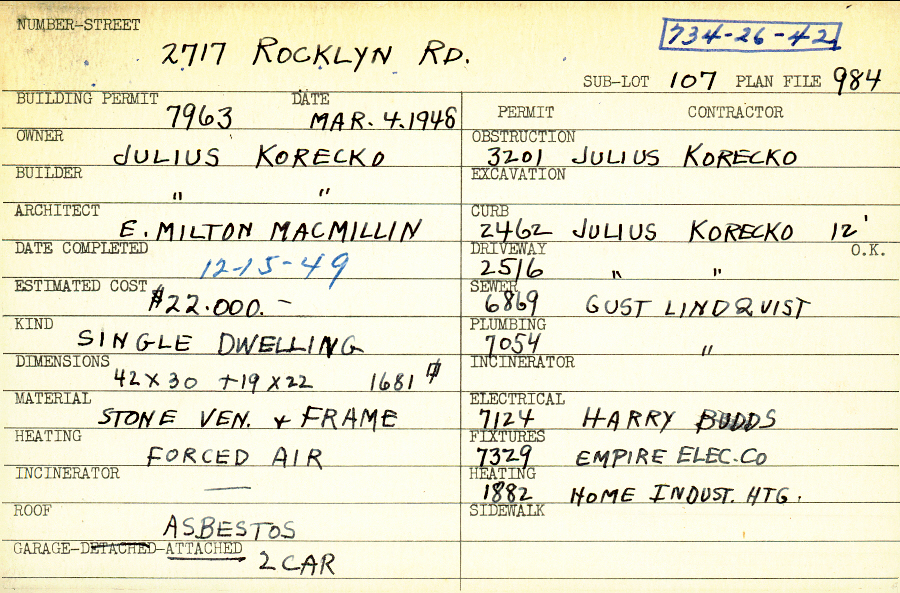 2717 Rocklyn Road Shaker Heights, OH 44122 PARCEL ID: 734-26-042 Building Permit Date: 03-04-1948 Plan File Number: 984 all scanned Microfilm Roll: Roll012 Neighborhood: Mercer Owner: Korecko, Julius Builder: Korecko, Julius Architect: MacMillin, E. Milton Estimated Cost: 22000 Date Completed: 12-15-1949 Kind: Single, Single Residence or Dwelling Material: Stone Veneer and Frame Heating: Forced Air Roof: Asbestos Garage: attached 2 car |