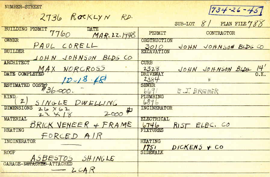 2736 Rocklyn Road Shaker Heights, OH 44122 PARCEL ID: 734-26-045 Building Permit Date: 03-22-1948 Plan File Number: 788 scanned, 8597 Microfilm Roll: Roll011 Neighborhood: Mercer Owner: Corell, Paul Builder: John Johnson Building Company Architect: Norcross, Max Estimated Cost: 36000 Date Completed: 10-18-1948 Kind: Single, Single Residence or Dwelling (2) Material: Brick Veneer and Frame Heating: Forced Air Roof: Asbestos Shingles Garage: attached 2 car |