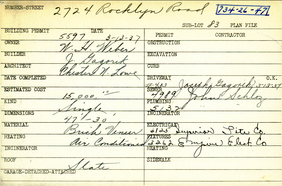 2724 Rocklyn Road Shaker Heights, OH 44122 PARCEL ID: 734-26-047 Building Permit Date: 03-13-1937 Plan File Number: 0 Neighborhood: Mercer Owner: Weber, W. H. Builder: Gagorik, J. Architect: Lowe, Chester N. Estimated Cost: 15000 Kind: Single, Single Residence or Dwelling Material: Brick Veneer Heating: Air Conditioned Roof: Slate Card Available: yes |