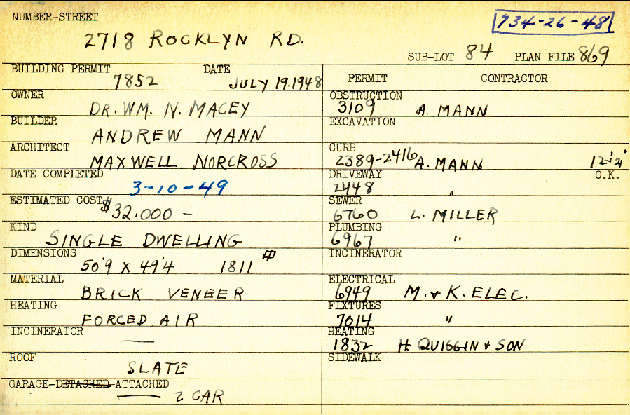 2718 Rocklyn Road Shaker Heights, OH 44122 PARCEL ID: 734-26-048 Building Permit Date: 07-19-1948 Plan File Number: 869 Neighborhood: Mercer Owner: Macey, Dr. William N. Builder: Mann, Andrew Architect: Norcross, Maxwell Estimated Cost: 32000 Date Completed: 03-10-1949 Kind: Single, Single Residence or Dwelling Material: Brick Veneer Heating: Forced Air Roof: Slate Garage: attached 2 car |