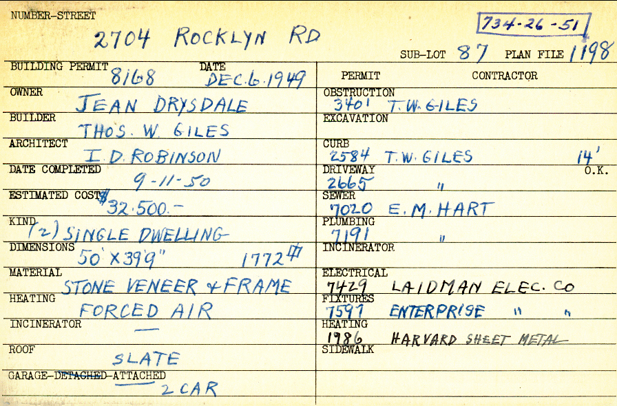 2704 Rocklyn Road Shaker Heights, OH 44122 PARCEL ID: 734-26-051 Building Permit Date: 12-06-1949 Plan File Number: 1198 scanned Microfilm Roll: Roll014 Neighborhood: Mercer Owner: Drysdale, Jean Builder: Giles, Thomas W. Architect: Robinson, I. D. Estimated Cost: 32500 Date Completed: 09-11-1950 Kind: Single, Single Residence or Dwelling (2) Material: Stone Veneer and Frame Heating: Forced Air Roof: Slate Garage: attached 2 car |