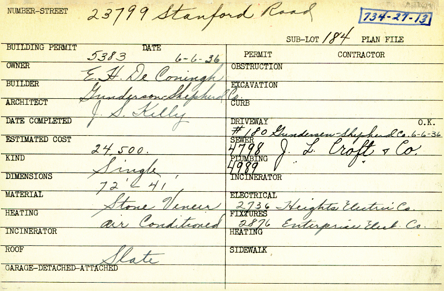 23799 Stanford Road Shaker Heights, OH 44122 PARCEL ID: 734-27-013 Building Permit Date: 06-06-1936 Plan File Number: 12441 all scanned Microfilm Roll: NewRoll13 Neighborhood: Mercer Owner: De Coningh, E. H. Builder: Gunderson-Shepherd Company Architect: Kelly, John Sherwood Estimated Cost: 24500 Kind: Single, Single Residence or Dwelling Material: Stone Veneer Heating: Air Conditioned Roof: Slate Blueprints: online, see link above |