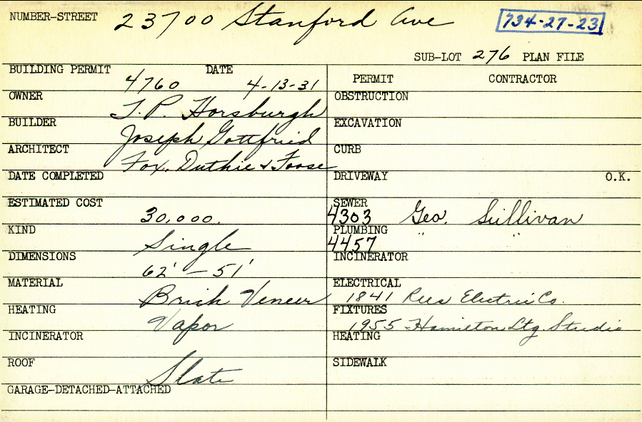 23700 Stanford Road Shaker Heights, OH 44122 PARCEL ID: 734-27-023 Building Permit Date: 04-13-1931 Plan File Number: 0 Neighborhood: Mercer Owner: Horsburgh, T. P. Builder: Gottfried, Joseph Architect: Fox, Duthie and Foose Estimated Cost: 30000 Kind: Single, Single Residence or Dwelling Material: Brick Veneer Heating: Vapor Roof: Slate |