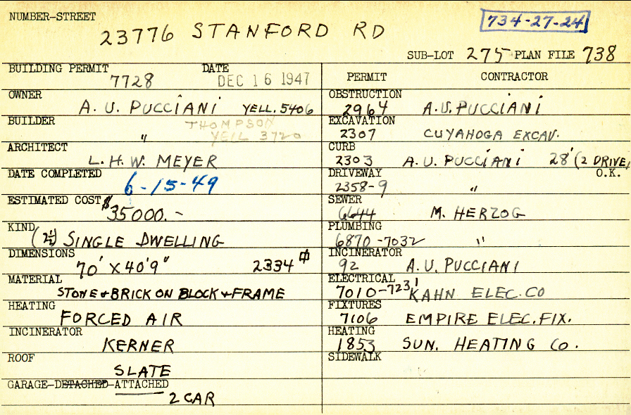 23776 Stanford Road Shaker Heights, OH 44122 PARCEL ID: 734-27-024 Building Permit Date: 12-16-1947 Plan File Number: 738 all scanned Microfilm Roll: Roll010 Neighborhood: Mercer Owner: Pucciani, A. U. Builder: Pucciani, A. U. Architect: Meyer, L. H. W. Estimated Cost: 35000 Date Completed: 06-15-1949 Kind: Single 2-1/2 Material: Stone and Brick on BLock and Frame Heating: Forced Air Roof: Slate Garage: attached 2 car |