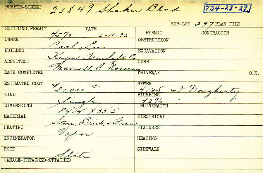 23849 Shaker Boulevard Shaker Heights, OH 44122 PARCEL ID: 734-27-029 Building Permit Date: 06-11-1930 Plan File Number: 0 Neighborhood: Mercer Owner: Lee, Carl Builder: Keyes - Treuhaft Company Architect: Norcross, Maxwell A. Estimated Cost: 30000 Kind: Single, Single Residence or Dwelling Material: Stone, Brick and Frame Heating: Vapor Roof: Slate Card Available: yes |